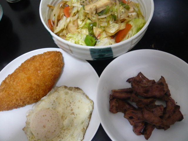 バカの1つ覚え的ヤタイイサメ・目玉焼き・お惣菜の白身魚フライ・ハツを焼いたヤツ